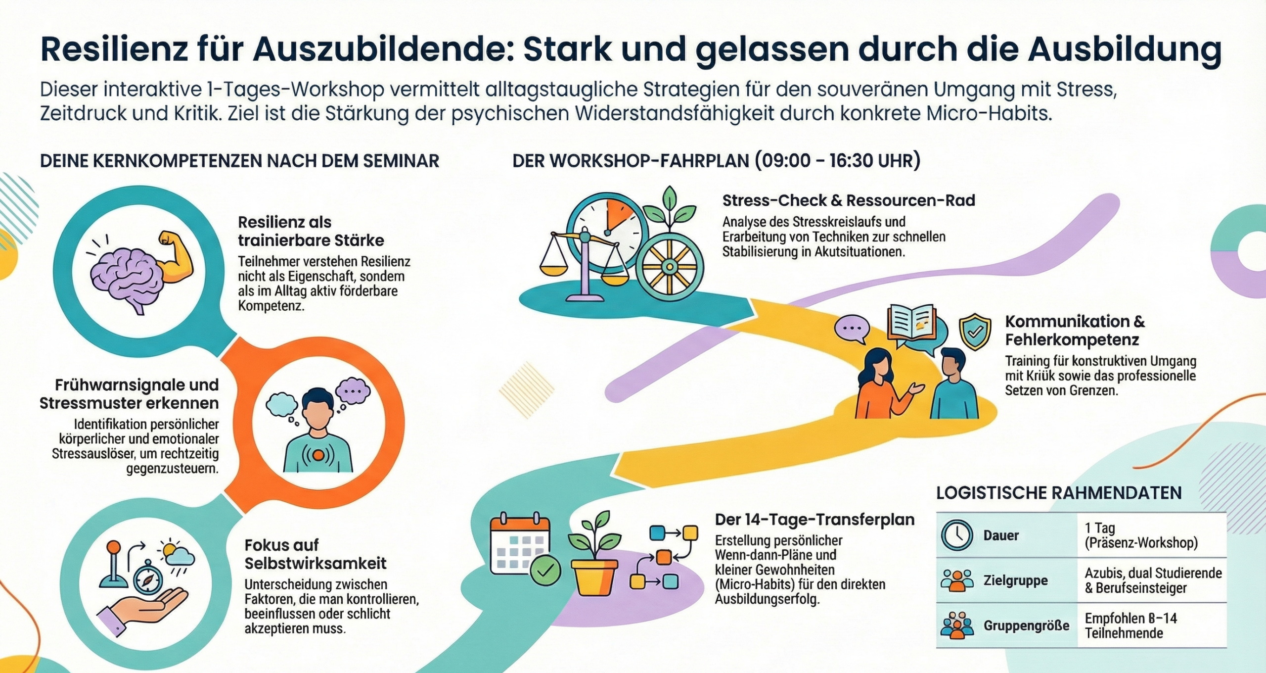 Resilienz hilft Auszubildenden, mit Stress, Druck und Feedback sicherer umzugehen – ohne auszubrennen oder sich selbst zu blockieren. In diesem 1-Tages-Workshop trainieren die Teilnehmenden alltagstaugliche Strategien für Selbstregulation, Fokus, Kommunikation und einen konkreten Transfer in den Ausbildungsalltag.