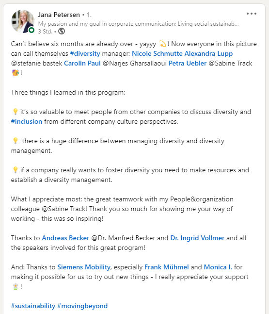 Die Absolventinnen des WSDM – Jahrgang 2021 wurden auf die Übernahme herausragender Fach- und Führungspositionen im Diversity Management systematisch vorbereitet. Diversity Management ist ein bedeutendes Wachstumsthema der Unternehmensführung, die beruflichen Chancen für die nun umfassend qualifizierten Diversity Managerinnen sind sehr gut. Mit dem Abschluss des WSDM stehen den Diversity Managerinnen viele neue berufliche Optionen offen.