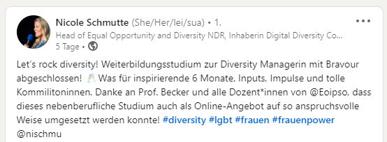 Die Resonanz der WSDM Absolventinnen zum erfolgreich abgeschlossenen Weiterbildungsstudium Diversity Management WSDM ist sehr positiv. Inhalt, Online-Technik, Diskussion, Beratung während des Studiums und bei der Anfertigung der Abschlussarbeit wurden sehr positiv bewertet.
